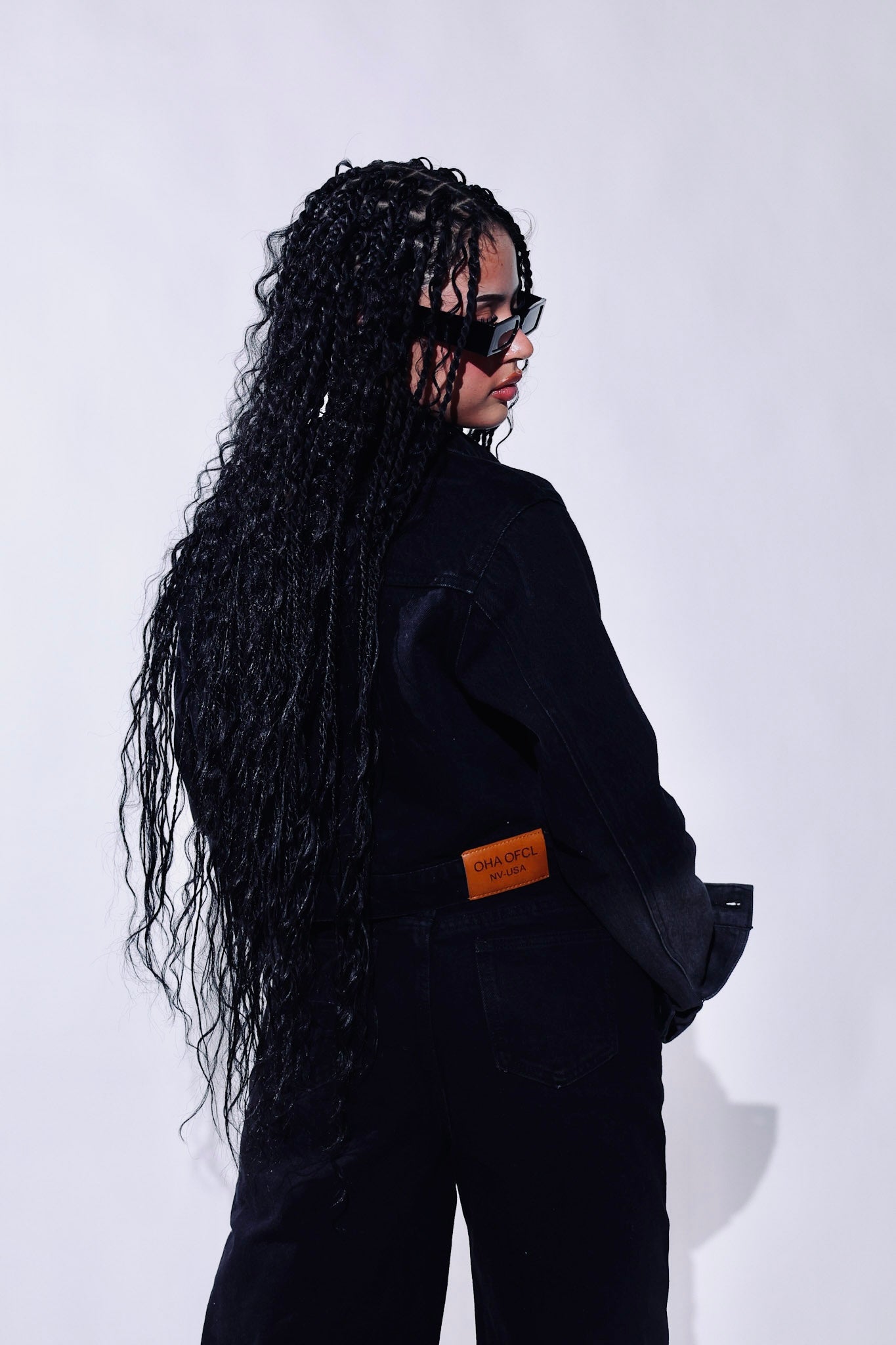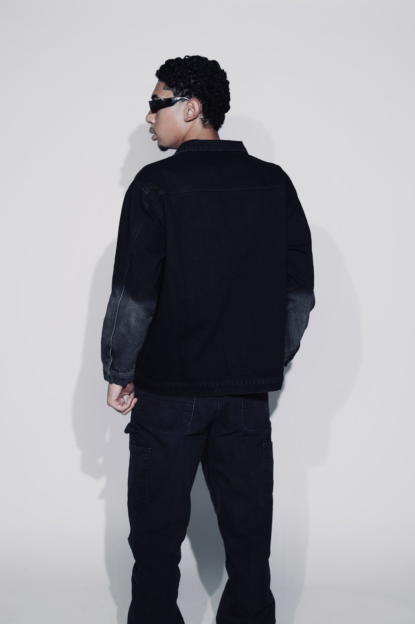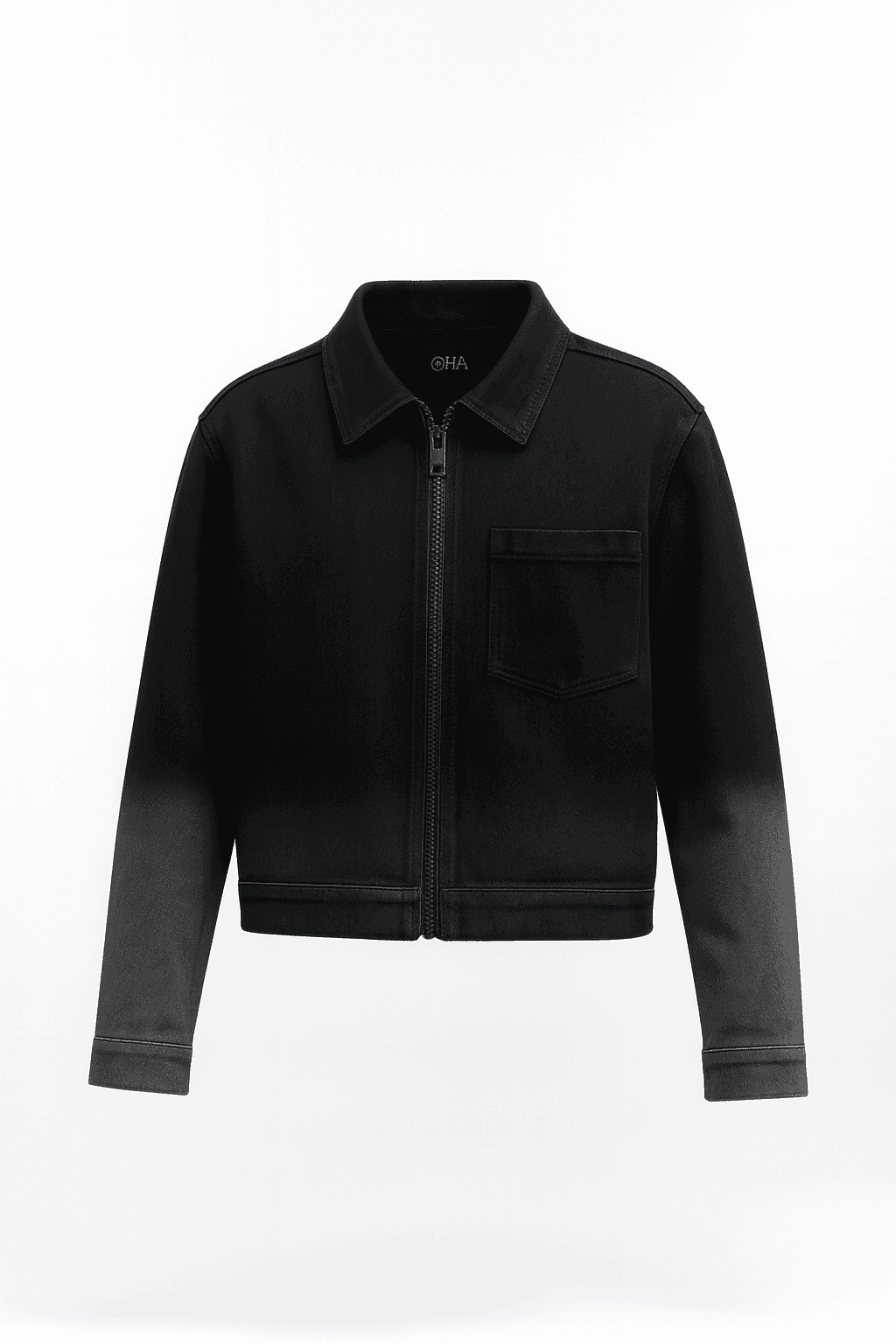 Crafted from premium Japanese denim, this piece embodies evolution and rebellion. Designed cropped for women and true to size for men, it features a black-to-grey ombré fade along the sleeves and a leather ØHA patch on the back — a symbol of transformation and individuality.